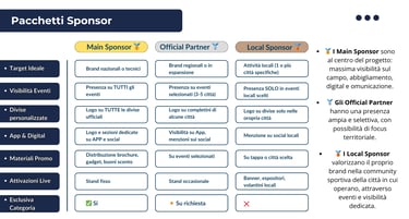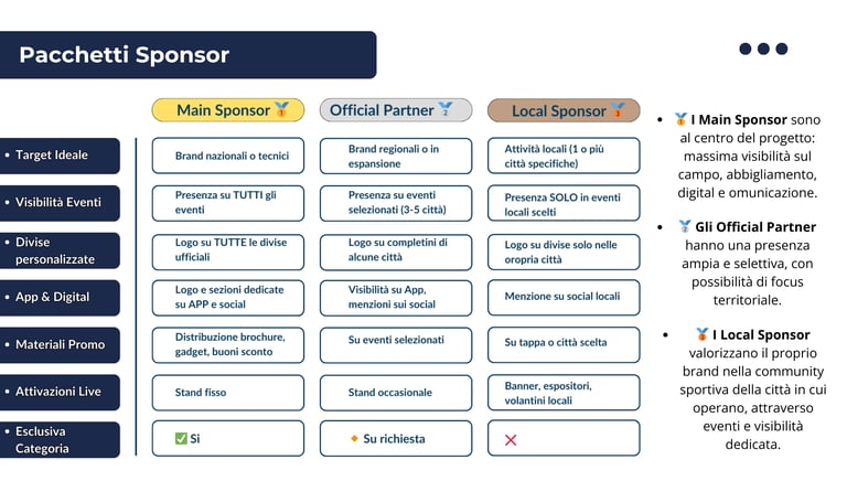 Offriamo diverse opportunità di sponsorizzazione per aziende che desiderano associarsi a un progetto sportivo dinamico e in crescita. I nostri pacchetti sono pensati per garantire visibilità e coinvolgimento, con vantaggi personalizzati in base al livello scelto. Scegli il pacchetto che meglio si adatta alle tue esigenze e unisciti a noi nel promuovere lo sport e i suoi valori.